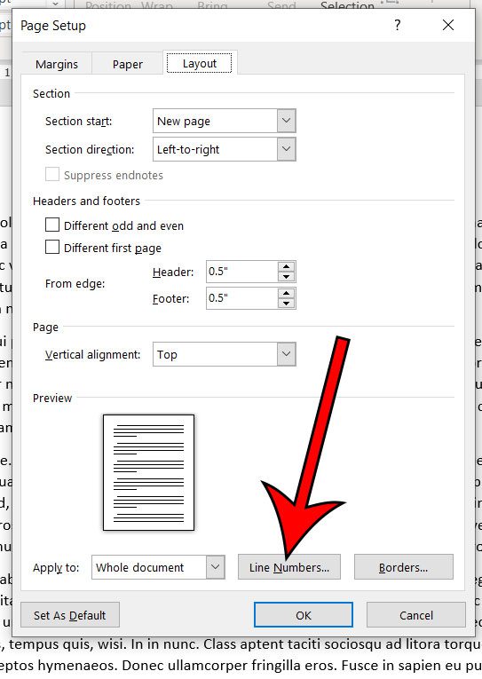 有一个适用于左侧的下拉菜单行号按钮进入步骤5。您可以选择这点向前如果您想在文档开头以外的位置开始行编号,请选择此选项。请注意,在启用行编号之前,您需要关闭窗口并将光标置于所需的起点。