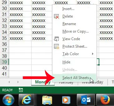 步骤 2:右键单击窗口底部的工作表选项卡之一,然后单击选择所有工作表选项。