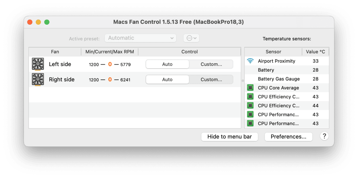 现在,您可能会听到 Mac 风扇的运行速度比以前更快或更慢(取决于您是提高还是降低速度)。当您的 CPU 冷却后,请不要忘记将设置恢复为“自动”,以防止风扇磨损。如果您使用 Mac 风扇控制来加快风扇速度,则问题解决后还需要选择“自动”。