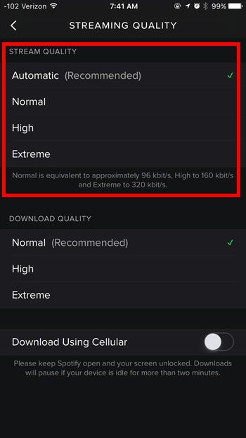 幸运的是,iPhone 上的 Spotify 应用程序具有可调节的流媒体质量设置,您可以选择“正常”、“高”或“极限”(如果您是高级订阅者)。
