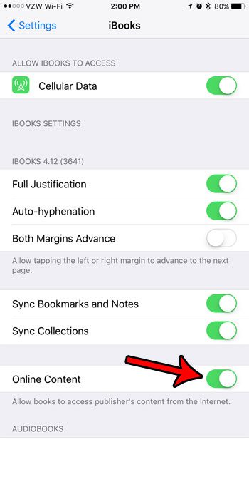 您会注意到此屏幕顶部有一个选项,显示“蜂窝数据”。如果您希望 iBooks 在使用蜂窝网络时能够访问在线内容,则还需要打开此选项。否则,您只能在连接到 Wi-Fi 网络时才能使用 iBooks 中的在线内容。