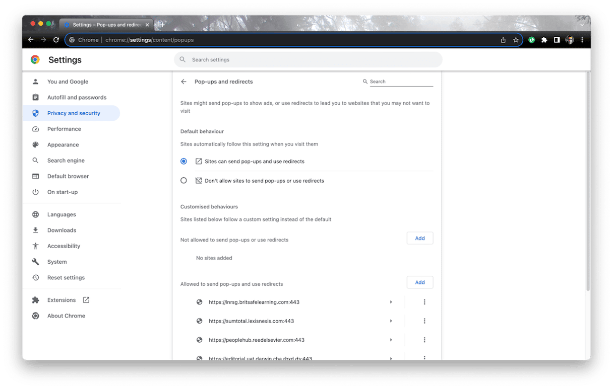 - 确保在侧边栏中选择“隐私和安全”,然后向下滚动到“弹出窗口和重定向”。