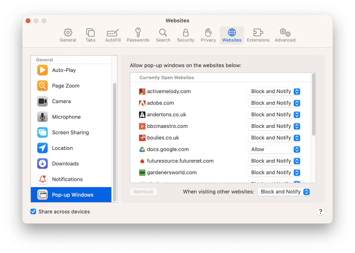 - 前往“设置”>“网站”,然后选择“弹出窗口”。
