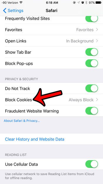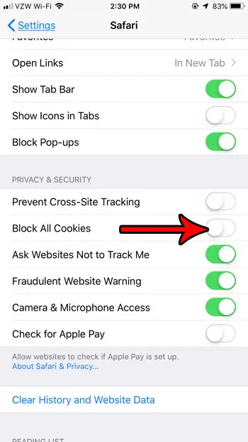 下面我们的文章继续提供有关在 iPhone 上的 Safari 中启用 Cookie 的更多信息,包括这些步骤的图片。