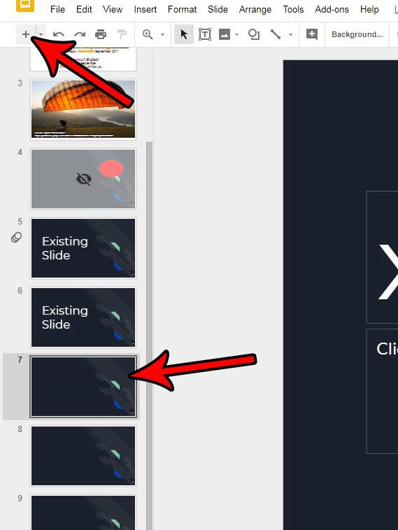 步骤 2:从窗口左侧的幻灯片栏中选择现有幻灯片。如果您想创建新幻灯片,请单击+按钮位于屏幕顶部附近工具栏左侧。