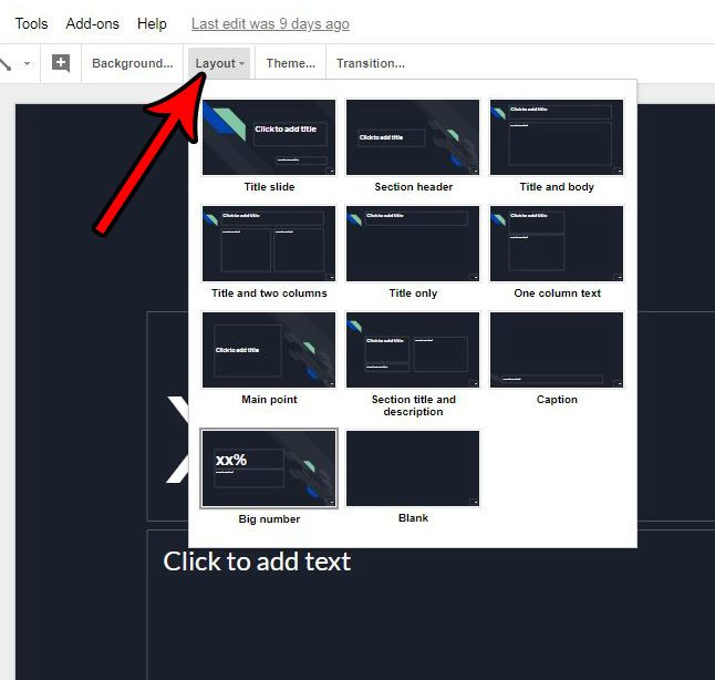 第 3 步:单击布局按钮,然后选择要应用于幻灯片的默认布局。
