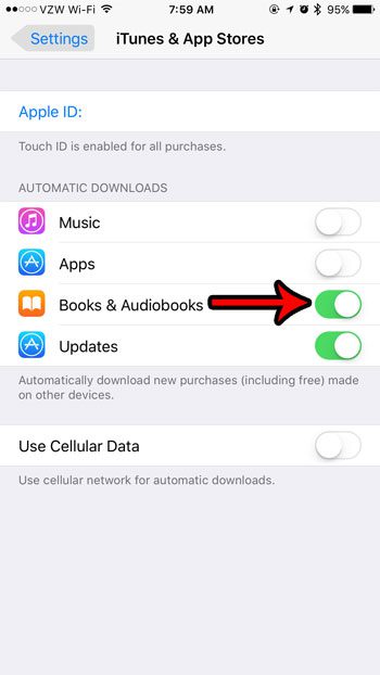 本文中的步骤是在运行 iOS 10.3.3 的 iPhone 7 Plus 上执行的。通过启用此设置,您将告诉您的 iPhone,如果购买的书籍和有声读物是在使用您 Apple ID 的另一台设备上进行的,它应该自动将购买的书籍和有声读物下载到您的 iPhone 7。