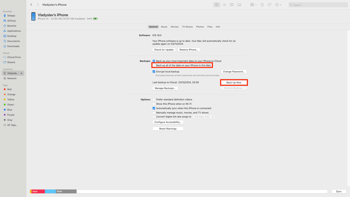 将 iPhone 备份到 Mac 可确保安全存储所有重要数据,例如联系人、消息、照片、视频和应用程序数据。如果您的 iPhone 丢失、被盗、损坏或将数据传输到新设备,您可以通过此功能恢复您的信息。