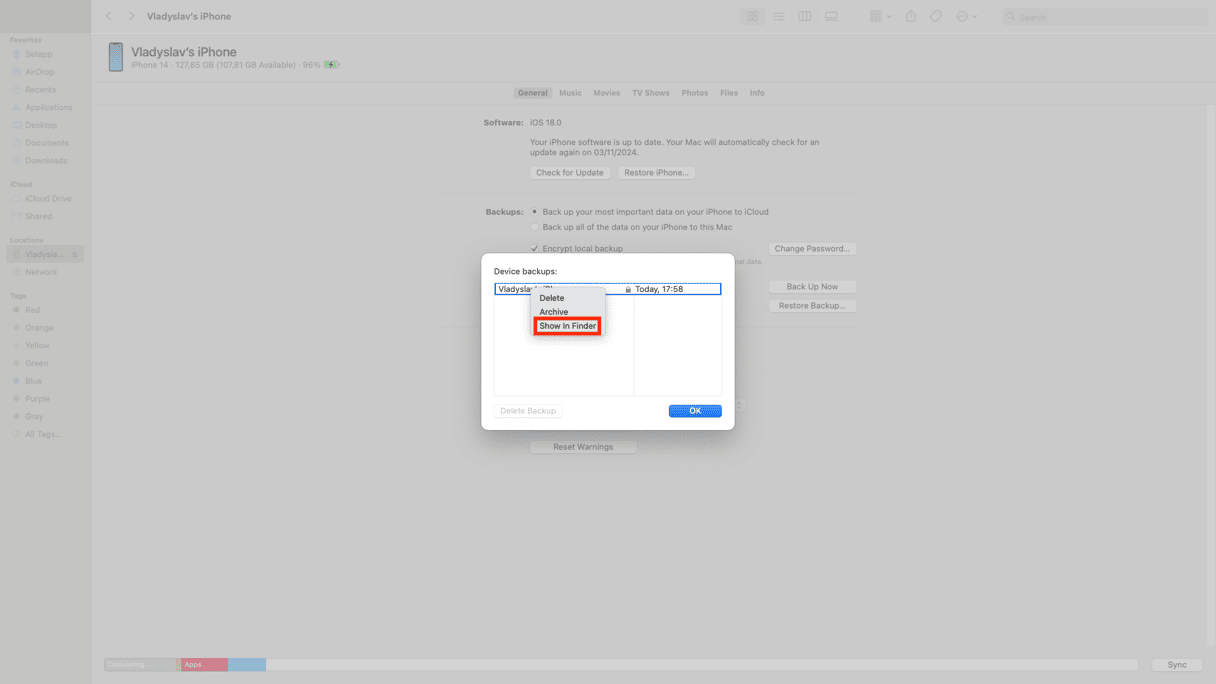 - 按住 Control 键并单击(或右键单击)您要查找的备份。