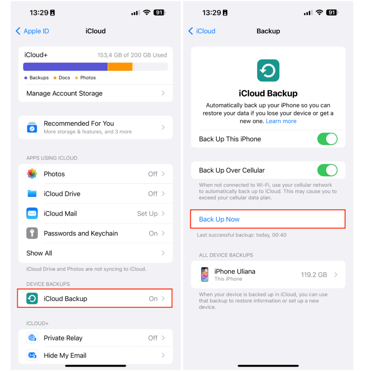 - 未配置 iCloud 备份。必须将 iCloud 配置为在“设置”>“帐户名称”>“iCloud”>“iCloud 备份”中自动备份手机 - 就像我们上面概述的那样。