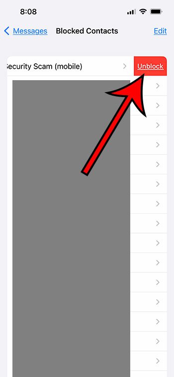 步骤 4:向左滑动您要取消屏蔽的联系人,然后点击解锁按钮。