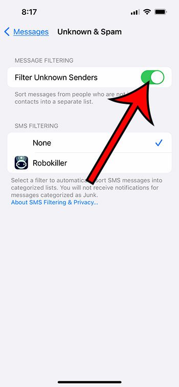您可以通过以下步骤打开此 iPhone 消息过滤并开始过滤未知发件人: