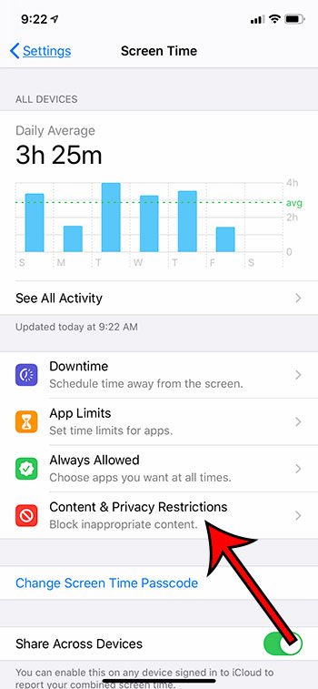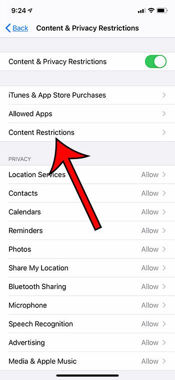 现在您应该位于“内容和隐私限制”菜单上。如果没有,您可以通过访问找到它设置 > 屏幕时间 > 内容和隐私限制。