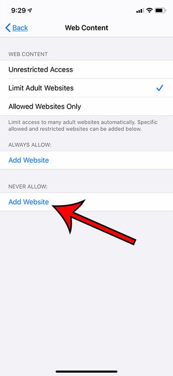 步骤 3:触摸添加网站按钮下绝不允许。