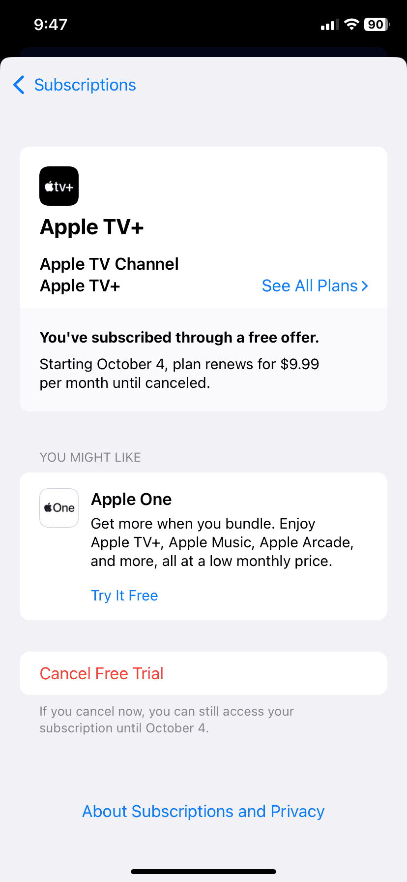 - 如果您是 Apple One 捆绑包的一部分,则取消 Apple TV+ 也会取消整个捆绑包。您可以选择单独重新订阅个别服务。