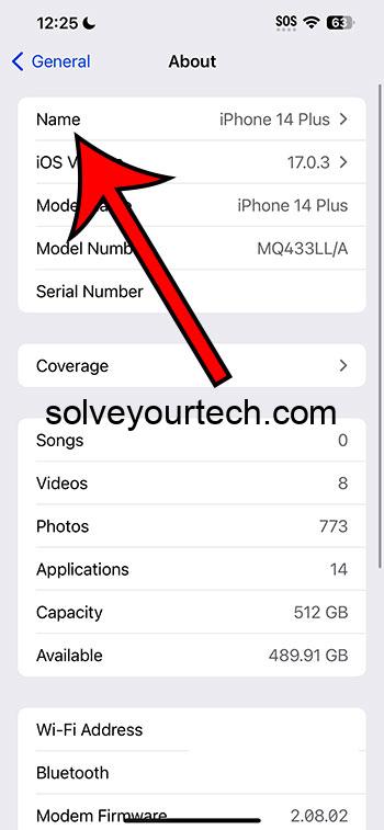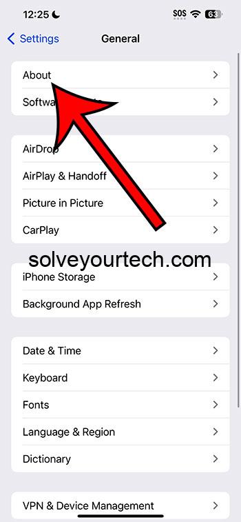 在这里,在列表顶部查找“关于”并选择它。 iPhone 的这一部分包含有关您设备的大量信息,但目前我们重点关注“名称”字段。