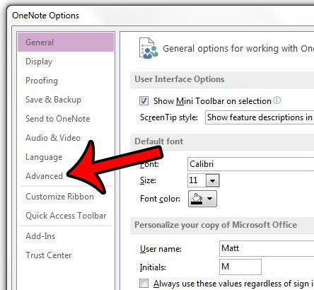 第 4 步:单击先进的选项卡上的OneNote 选项窗户。