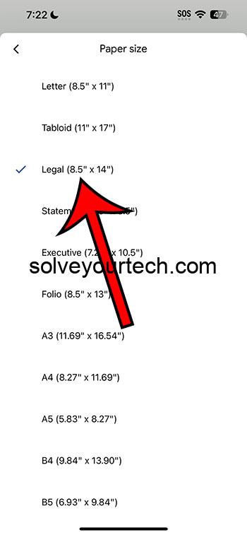 如果应用程序中没有您需要的纸张尺寸,您可能必须在计算机上使用 Google 文档网络版才能访问更多选项。