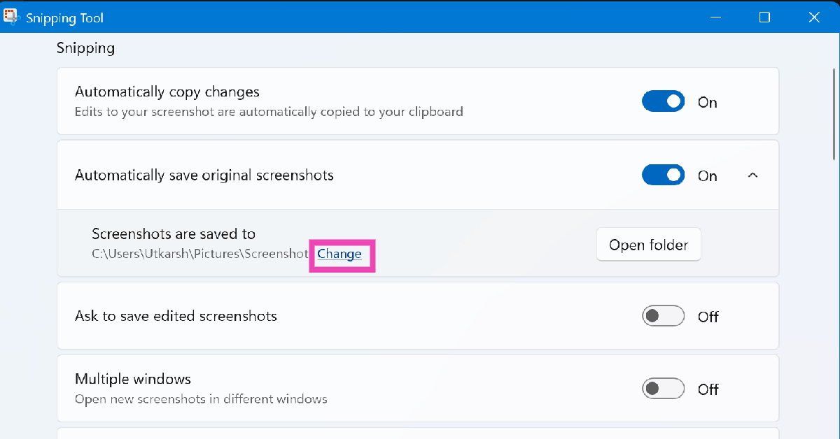 启动截图工具,点击省略号,转到“设置”,然后单击“屏幕截图保存到”旁边的“更改”。转到您的首选目的地并单击“选择文件夹”。