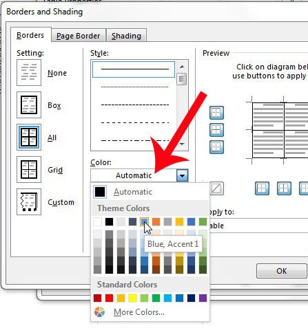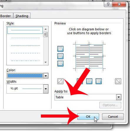 步骤 8:对表格边框样式或线宽进行任何其他更改,确认桌子被选择在适用于窗口右侧的选项,然后单击好的按钮。