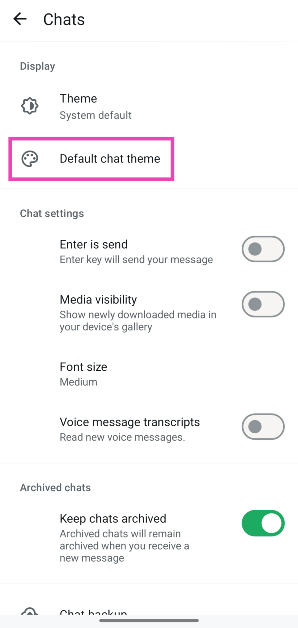 前往设置>聊天>默认聊天主题>壁纸并从列表中选择图像。