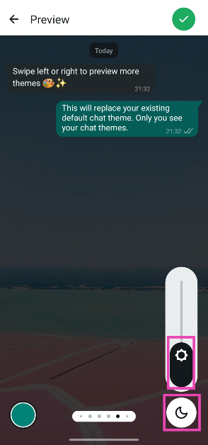 前往设置>聊天>默认聊天主题,选择一个主题,点击右下角的图标可更改亮度,点击左下角的图标可更改聊天气泡的颜色。