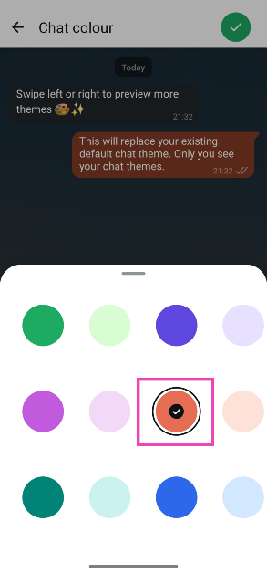 聊天颜色:WhatsApp 为聊天气泡提供了总共 20 种颜色选项。其中包括各种色调的蓝色、绿色、紫色、棕色、粉色等。