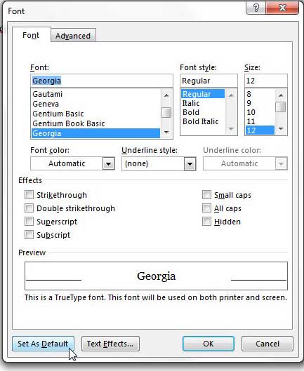 步骤 4:从窗口的各个部分中选择您喜欢的字体、样式大小和颜色,然后单击设置为默认值按钮位于窗口的左下角。