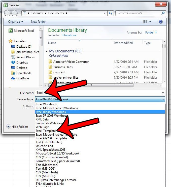 第 6 步:更改文件名到书,然后单击另存为类型下拉菜单并选择Excel模板选项。记下保存文件的位置,然后单击“保存”按钮。