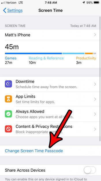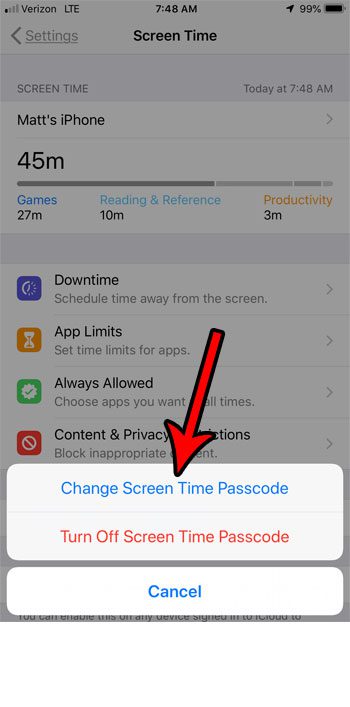 我们的文章在下面继续提供有关更改 iPhone 屏幕时间密码的更多信息,包括这些步骤的图片。
