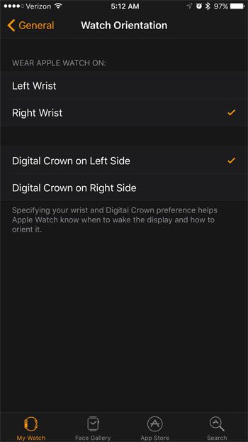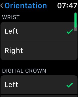当您首次在 iPhone 上设置 Apple Watch 时,您必须选择要佩戴该设备的手腕,以及数字表冠所在的一侧。这会导致 Apple Watch 自动调整其脸部方向,以便您可以看到它。
