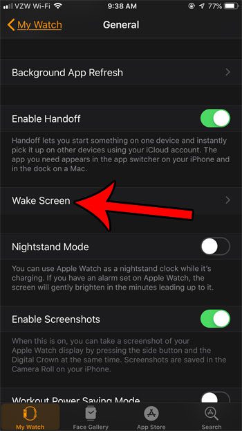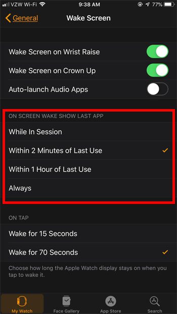 第 5 步:点击下方的选项屏幕唤醒显示最后一个应用程序这对应于您希望手表在上次使用后打开应用程序的时间。