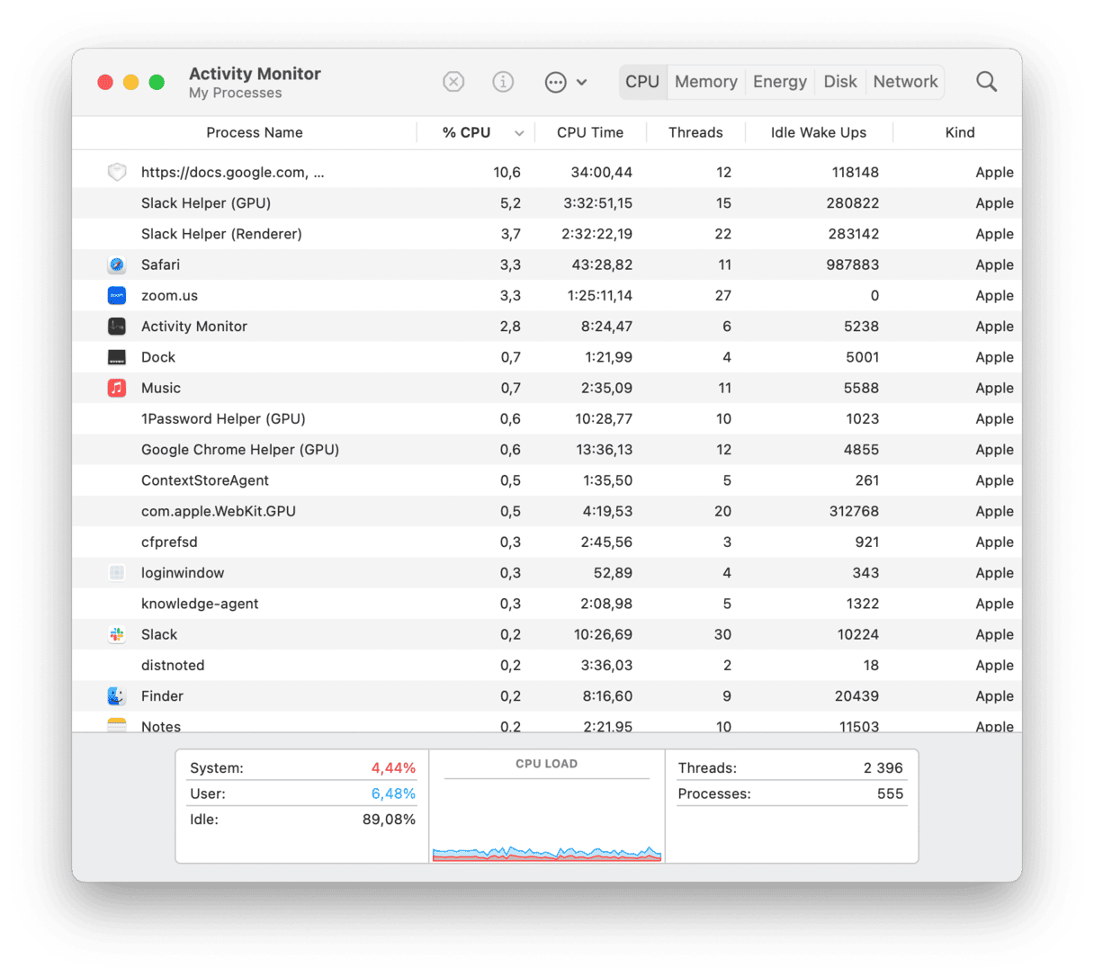 应用程序或进程可能会阻止您的系统响应。在这种情况下,活动监视器就派上用场了。它允许您追踪有问题的应用程序或进程、检查最重要的能源消耗者并监控 CPU 磁盘使用情况。您还可以使用它来检测恶意软件。