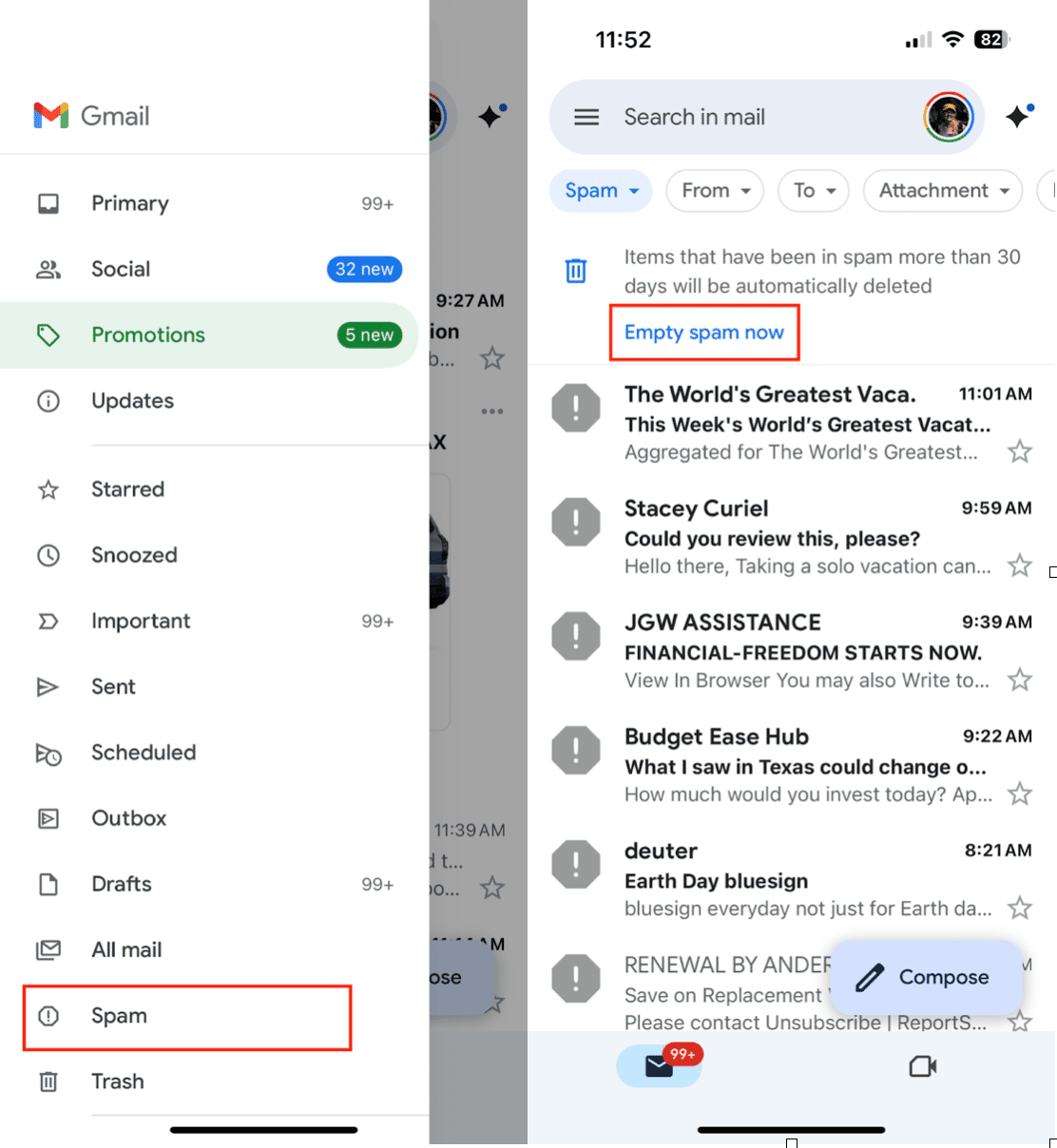 - 点击菜单 (☰) 并滚动到垃圾邮件。