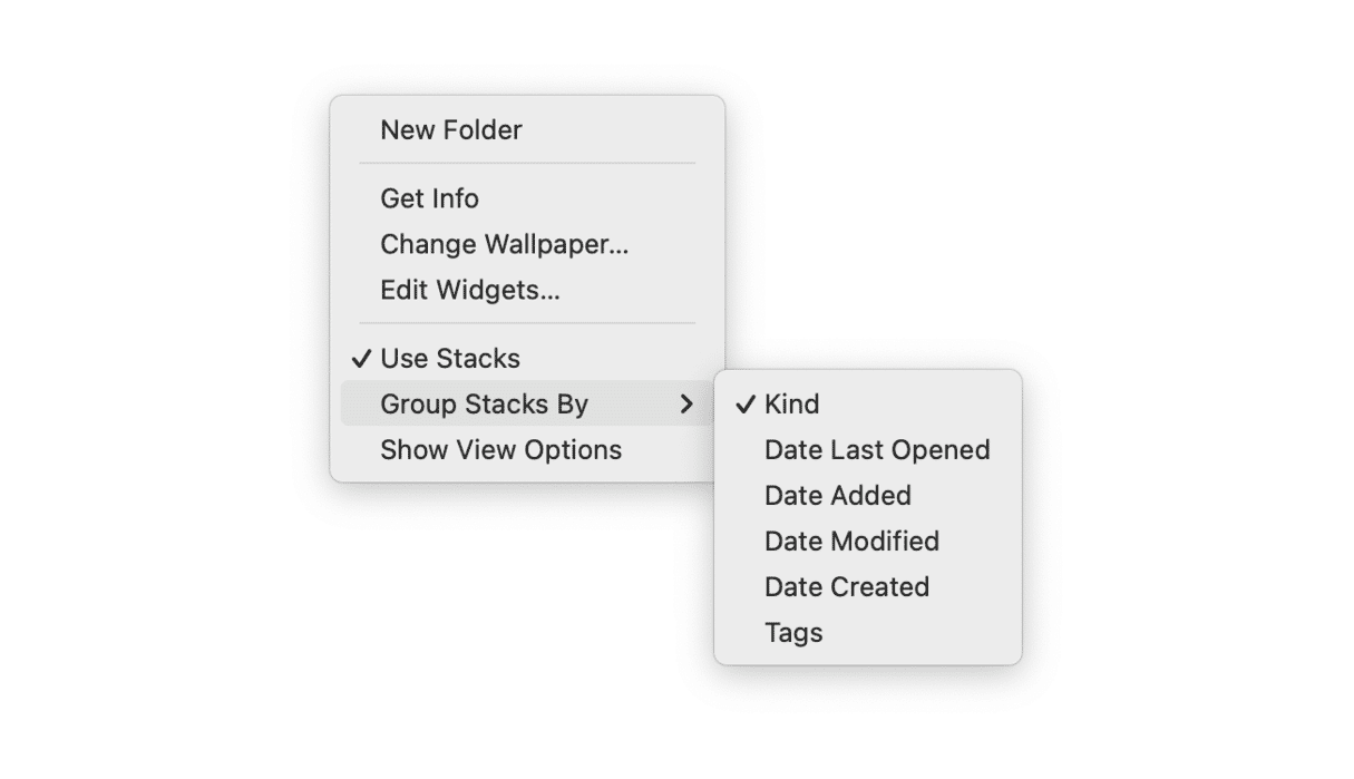 如果您没有心情手动添加结构,macOS 可以通过名为 Stacks 的功能为您完成此操作。启用它后,所有文件都会按电影、屏幕截图或图片等文件类型整齐地分组。