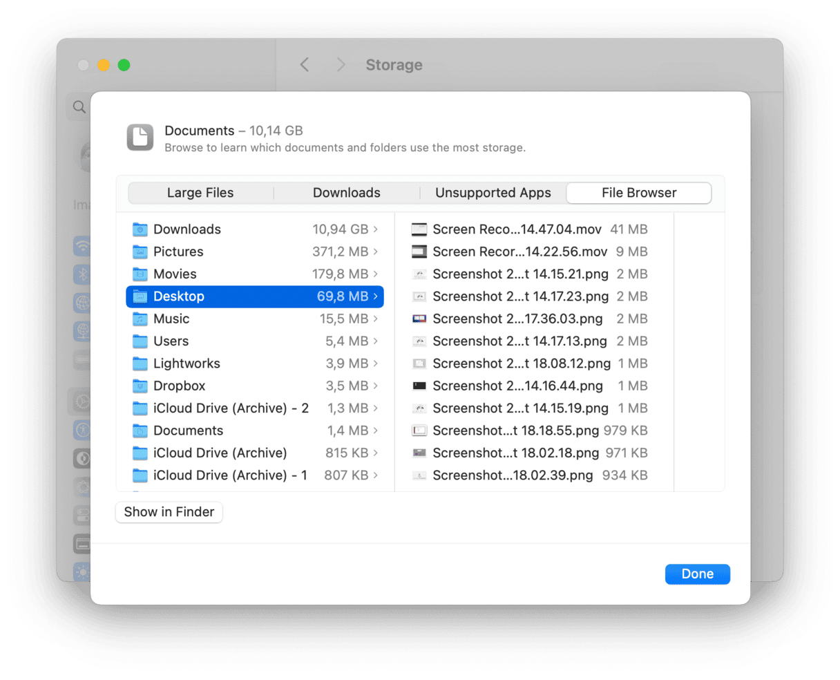 您还可以使用内置的优化存储功能来删除文件。只需转到“系统设置”>“常规”>“存储”,然后单击“文档”旁边的 i。如果您现在单击文件浏览器并选择桌面,您将看到其中列出的所有文件以及它们占用的空间。