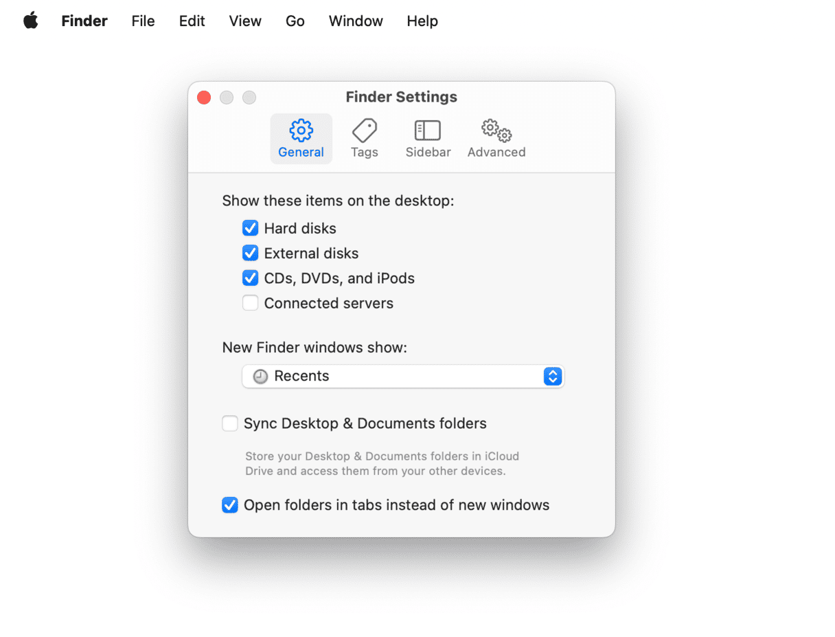 - 在“常规”选项卡中,取消选中“硬盘”、“外部磁盘”、“CD、DVD 和 iPod”以及“连接的服务器”旁边的复选框。