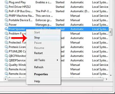 第14步:右键单击后台打印程序,然后单击停止选项。暂时保持此窗口打开。