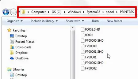 第十七步:双击视窗文件夹,双击系统32, 双击线轴,然后双击打印机。所以你现在想要的位置是C:\Windows\System32\spool\PRINTERS,它应该类似于下图。