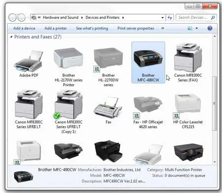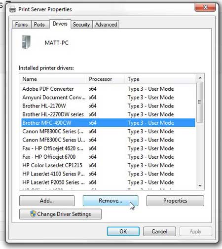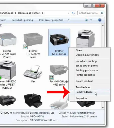 步骤 3:找到您要删除的打印机。在这种情况下,我们将删除 Brother MFC 490CW。