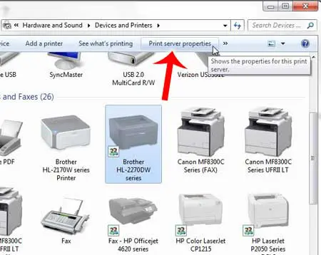 步骤 6:单击另一个打印机图标一次将其选中,然后单击打印服务器属性窗口顶部蓝色栏中的选项。