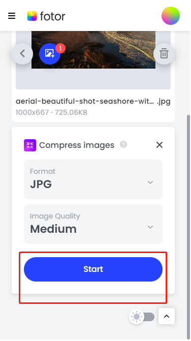 4. 单击“开始”按钮。然后 Fotor 会自动立即将您的图像压缩为较小的高质量文件。