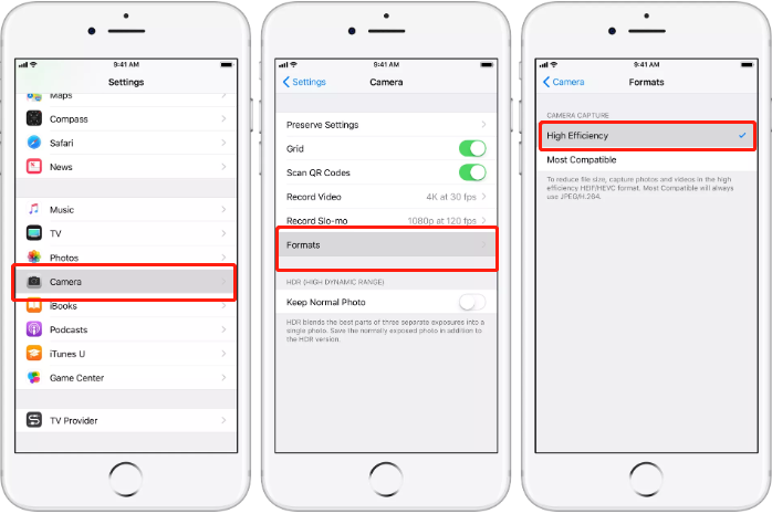 在 iPhone 上压缩照片的另一种快速方法是将其保存为 HEIC 格式。 iOS 11 及更高版本引入了这种新的行业标准媒体格式。它允许您在设备和 iCloud 上使用更少的存储空间,同时保持相同的视觉质量。