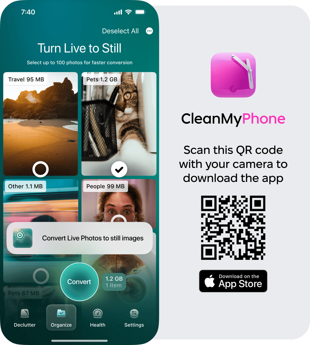 CleanMy®手机使将实时照片转换为静态图像并释放空间变得异常简单。该应用程序无需手动挖掘您的图库,而是找到您的所有实时照片,让您批量查看它们,使用关键帧将它们转换为静态图像,并用 HEIC 格式的较小静态图像替换原始实时文件。您一次最多可以转换 100 张照片。
