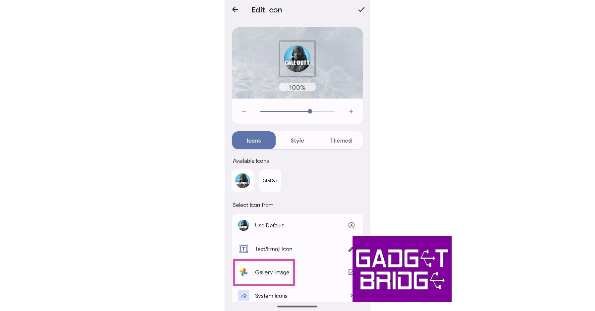 第4步:点击图标并从您的设备中选择一张图像画廊。您还可以设置一个文本/表情符号图标或选择一个系统图标。