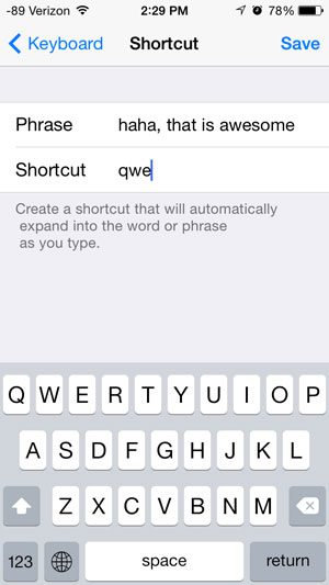 步骤 5:输入您希望能够使用快捷方式创建的短语,输入您要用于创建短语的快捷方式,然后触摸节省按钮位于屏幕右上角。在下面的示例图中,每当我输入“qwe”时,它都会自动将其替换为“哈哈,太棒了”。