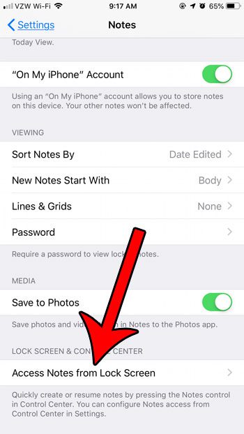 步骤 8:滚动到菜单底部并选择从锁定屏幕访问笔记按钮。