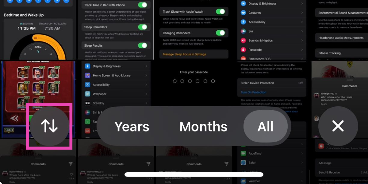 转到“照片”应用程序,向下滚动,然后点击带有两个箭头的图标。从弹出菜单中取消选中“显示屏幕截图”选项。