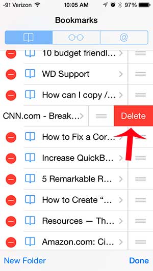 步骤 4:触摸要删除的书签左侧带有白线的红色圆圈。