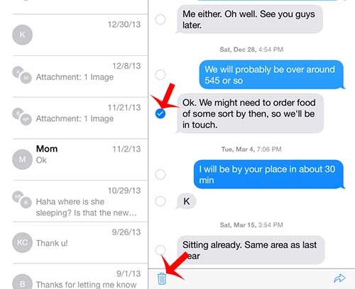 步骤 3:触摸要删除的短信左侧的圆圈。请注意,您可以选择多条消息进行删除。当您准备删除消息时,触摸屏幕底部的垃圾桶图标。